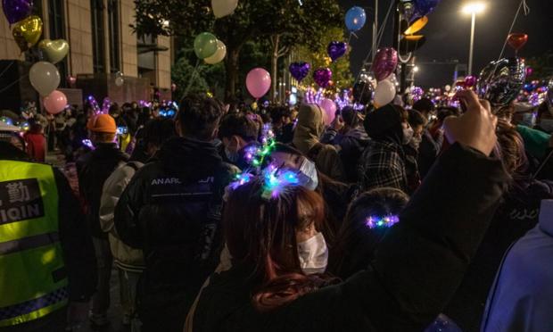 Οι πολίτες της κινεζικής πόλης πλημμύρισαν τους δρόμους γύρω από το δημαρχείο κρατώντας μπαλόνια, με κάποιους να φορούν μάσκες, άλλους να τις έχουν κατεβάσει κι άλλους να μην φορούν καθόλου.