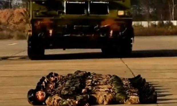 Για να δοκιμάσει την αντοχή των στρατιωτών στην ψυχολογική πίεση, ένα τεθωρακισμένο όχημα με ερπύστριες περνά πάνω από 7 άντρες ξαπλωμένους στο έδαφος.