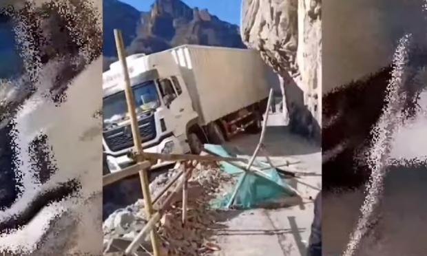 Μάλιστα όπως φαίνεται και στο βίντεο οι μπροστινοί τροχοί του οχήματος είναι μετέωροι στον αέρα. Μια λάθος κίνηση και το φορτηγό θα γκρεμιζόταν. Ο κ. Γου με εξαιρετικά ήρεμες κινήσεις κατάφερε να βγει από το όχημα, το οποίο τελικά ισορρόπησε στην άκρη του δρόμου.