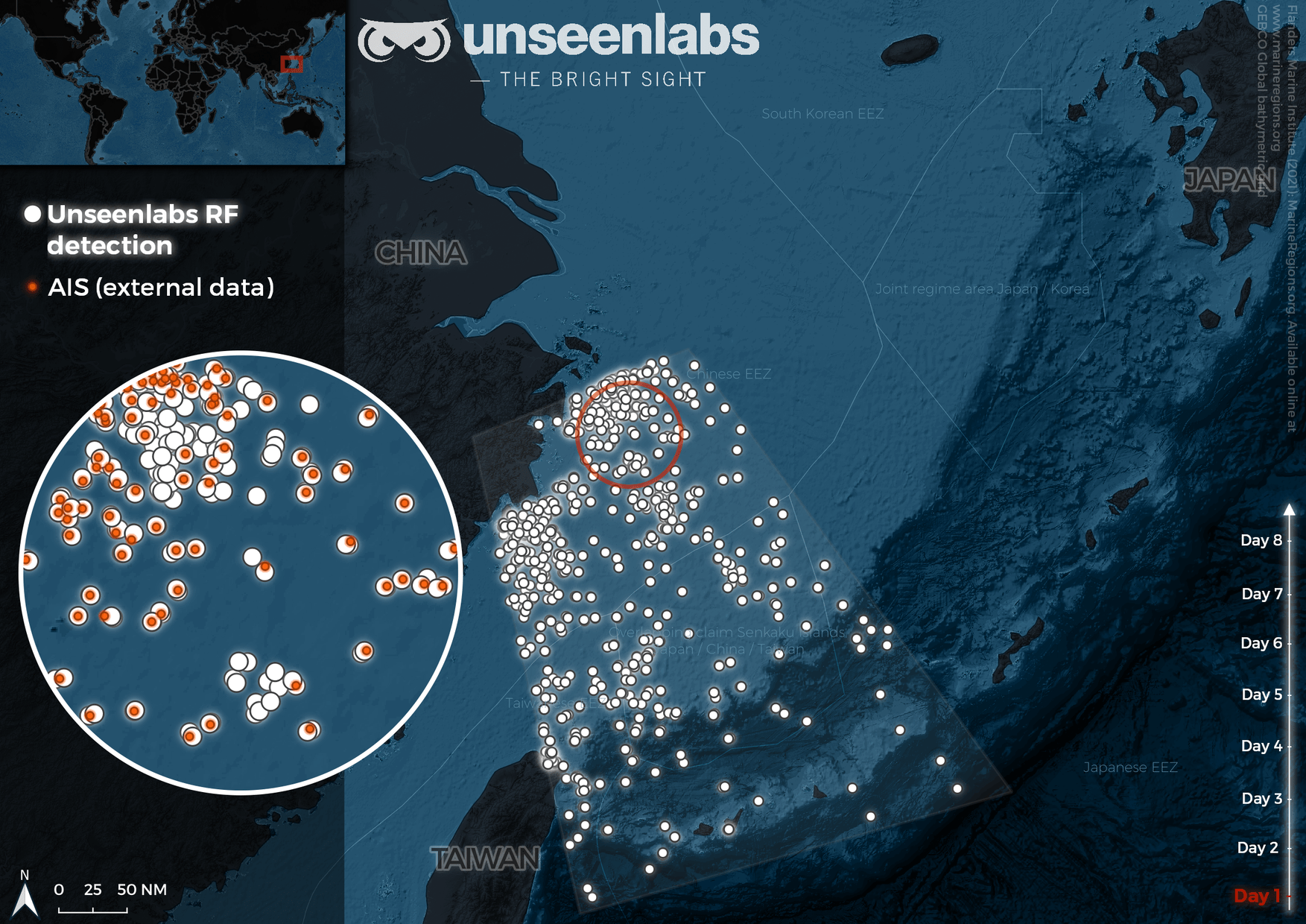 Το σύστημα ανίχνευσης ραδιοσυχνοτήτων της Unseenlabs επιτρέπει μια εξαντλητική εικόνα της θαλάσσιας κυκλοφορίας κοντά στις κινεζικές ακτές, αποκαλύπτοντας τον αριθμό και τη θέση όλων των πλοίων στην περιοχή, με ή χωρίς AIS.