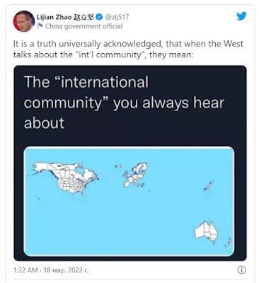 Ο εκπρόσωπος του κινεζικού υπουργείου Εξωτερικών Ζάο Λιτζιάν περιέγραψε τη δυτική άποψη για το πώς μοιάζει η διεθνής κοινότητα στον χάρτη του κόσμου χωρίς τη Ρωσία, το Μεξικό, την Ασία, την Αφρική και άλλα κράτη. Αυτόν τον χάρτη δημοσίευσε στο Twitter.