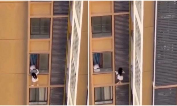 Σε βίντεο που κατέγραψαν γείτονες, η ερωμένη φαίνεται να κρέμεται στο κενό από τον 10ο όροφο της πολυκατοικίας, με τον δρόμο να απλώνεται επικίνδυνα από κάτω της. Οι αυτόπτες μάρτυρες ακούγονται να φωνάζουν έντρομοι, καθώς η γυναίκα παλεύει να κρατηθεί.