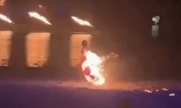 Ωστόσο τα πράγματα δεν εκτυλίχθηκαν όπως αναμενόταν, καθώς η φωτιά «αγκάλιασε» και το φόρεμα με αποτέλεσμα οι φλόγες να αρχίσουν να ανεβαίνουν προς την πλάτη της χορεύτριας.