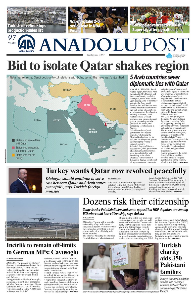 5 Ιουνίου: Η Σαουδική Αραβία, τα ΗΑΕ, το Μπαχρέιν, η Αίγυπτος, η Υεμένη και η κυβέρνηση της ανατολικής Λιβύης διακόπτουν τις διπλωματικές τους σχέσεις με το Κατάρ, κατηγορώντας το ότι στηρίζει «την τρομοκρατία».