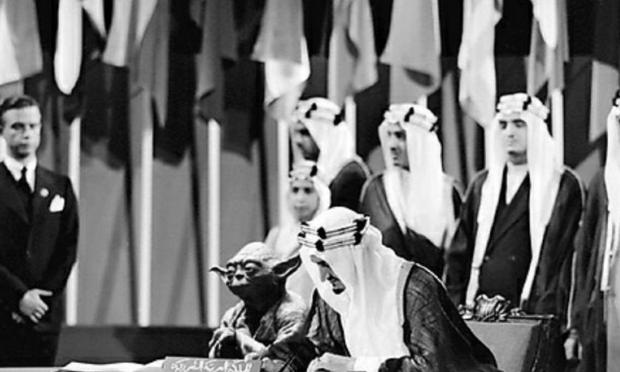 Η φωτογραφία, στην οποία ο Yoda κάθεται δίπλα στον βασιλιά Φαϊζάλ, την ώρα που εκείνος υπογράφει τον Καταστατικό Χάρτη του ΟΗΕ το 1935 δημιουργήθηκε από τον γνωστό σαουδάραβα ζωγράφο Shaweesh.