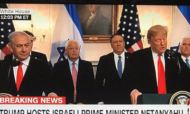 Μία εβδομάδα αργότερα, ο πρόεδρος Τραμπ έγραψε στο Twitter ότι «ήρθε η ώρα για τις ΗΠΑ να αναγνωρίσουν πλήρως την ισραηλινή κυριαρχία στα Υψίπεδα Γκολάν, τα οποία είναι στρατηγικής σημασίας για το κράτος του Ισραήλ και την περιφερειακή σταθερότητα».
