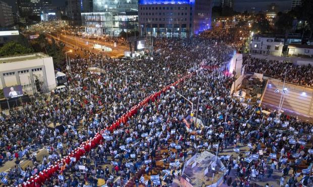 Η μεγαλύτερη συγκέντρωση έγινε ως είθισται στο Τελ Αβίβ, όπου χιλιάδες διαδηλωτές, τυλιγμένοι με ισραηλινές σημαίες, φώναζαν «Δημοκρατία» και συνθήματα εναντίον της κυβέρνησης που επιμένει στην προσπάθεια να εφαρμόσει το σχέδιο παρά τη σθεναρή αντίσταση που συναντά.