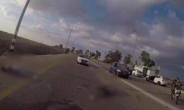 Το βίντεο έχει τραβηχτεί από την κάμερα που φοράει στη στρατιωτική στολή του ένας τρομοκράτης της Χαμάς. Οδηγώντας ένα μηχανάκι, πλησιάζει δύο σορούς γεμάτες αίματα που κείτονται στον δρόμο και ακούγεται να πανηγυρίζει!