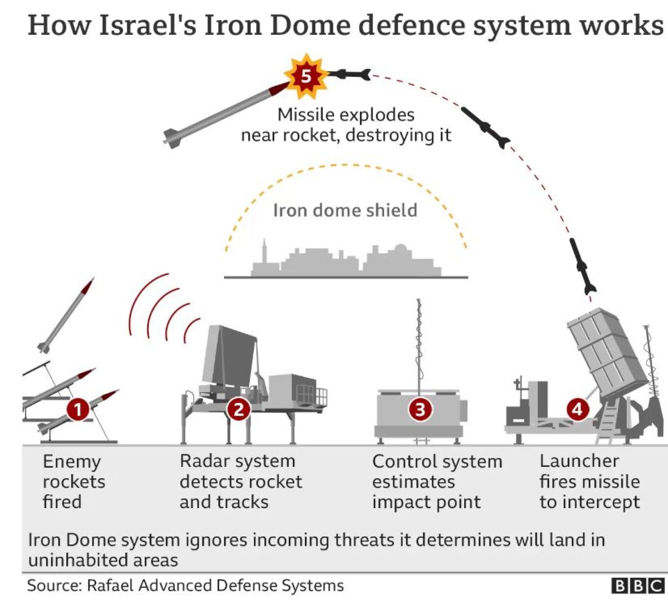 Το πιο γνωστό σύστημα αεράμυνας του Ισραήλ, το Iron Dome αποτελείται από ένα δίκτυο ανιχνευτών ραντάρ και εκτοξευτών πυραύλων που χρησιμοποιούνται για την αναχαίτιση εχθρικών πυρών, συμπεριλαμβανομένων πυραύλων μικρού βεληνεκούς.