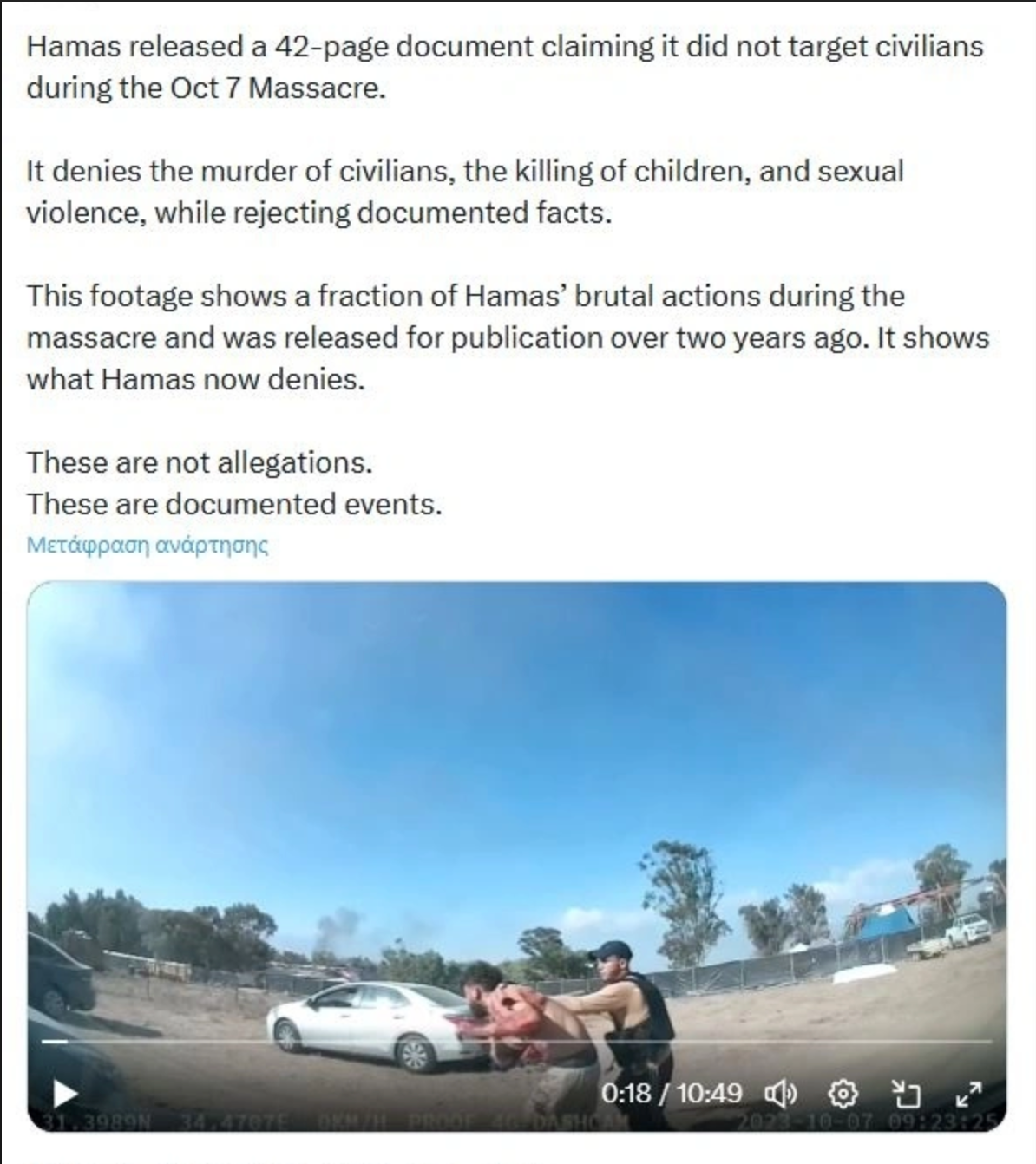 Σε μια εντυπωσιακή κίνηση αντιπαράθεσης με την πρόσφατη έκθεση της Χαμάς για τα γεγονότα της 7ης Οκτωβρίου 2023, ο Ισραηλινός Στρατός (IDF) δημοσίευσε ένα σκληρό βίντεο διάρκειας 11 λεπτών, στο οποίο εμφανίζονται εικόνες από τις φονικές επιθέσεις της Χαμάς κατά αμάχων στο νότιο Ισραήλ. Το βίντεο αναρτήθηκε στις επίσημες πλατφόρμες κοινωνικής δικτύωσης του στρατού ως αντίκρουση των ισχυρισμών που περιλαμβάνονται στην έκθεση που δημοσιεύτηκε πρόσφατα και επιμένει ότι οι άμαχοι δεν ήταν στοχοποιημένοι την ημέρα των επιθέσεων.