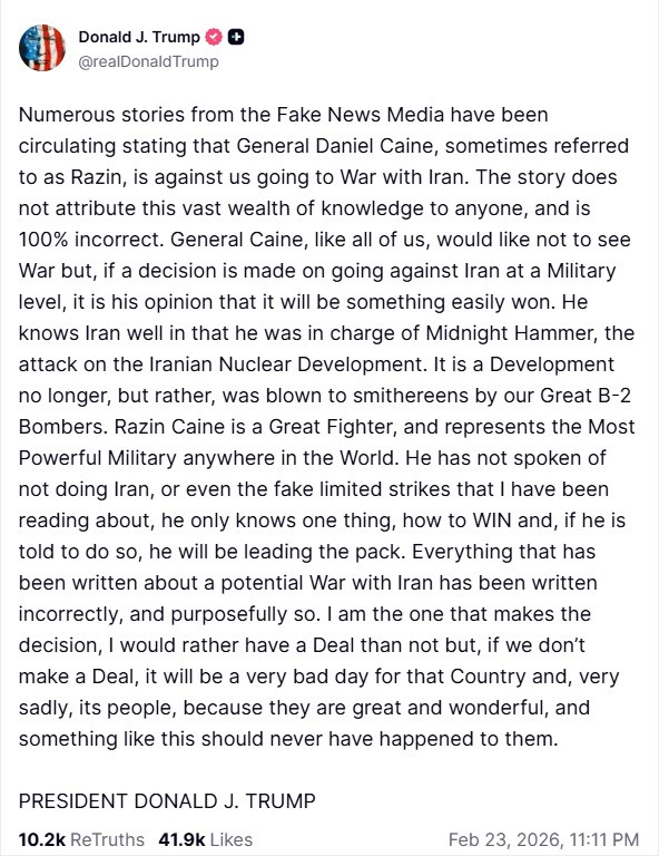 Ο Τραμπ, με το γνωστό επιθετικό του ύφος, έσπευσε να διαψεύσει τα δημοσιεύματα που ήθελαν τον Στρατηγό Ντάνιελ Κέιν (τον οποίο αποκάλεσε ειρωνικά "Razin") να φέρνει αντιρρήσεις. Χαρακτήρισε τις πληροφορίες περί εσωτερικών τριγμών ως «100% ψευδείς», τονίζοντας πως οι ΗΠΑ έχουν τη δύναμη να συντρίψουν το Ιράν «με συνοπτικές διαδικασίες».