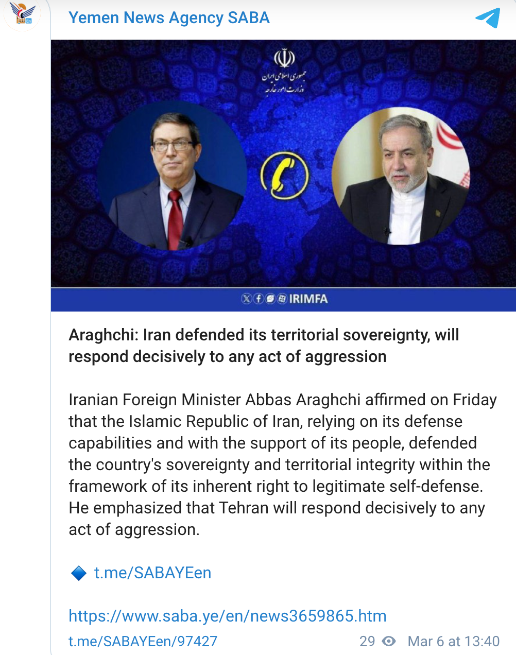 Οι συγκεκριμένες τοποθετήσεις έγιναν κατά τη διάρκεια τηλεφωνικής επικοινωνίας που είχε ο Αμπάς Αραγτσί με τον Κουβάνο ομόλογό του, Μπρούνο Ροντρίγκεζ Παρίγια. Κατά τη συζήτησή τους, ο Ιρανός αξιωματούχος αναφέρθηκε στις επιθέσεις των τελευταίων ημερών, χαρακτηρίζοντάς τες ως εγκλήματα των Ηνωμένων Πολιτειών και του Ισραήλ εναντίον του ιρανικού λαού.