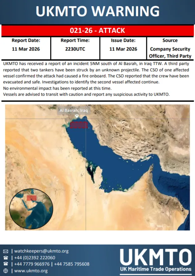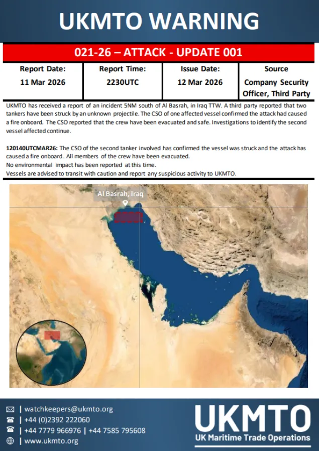 Σύμφωνα με τις ιρακινές αρχές και το κρατικό πρακτορείο ειδήσεων INA (το οποίο έκανε λόγο για πράξη «δολιοφθοράς»), δύο πετρελαιοφόρα δεξαμενόπλοια δέχθηκαν επίθεση εντός των ιρακινών χωρικών υδάτων, περίπου 30 ναυτικά μίλια από τις ακτές του νότιου Ιράκ.