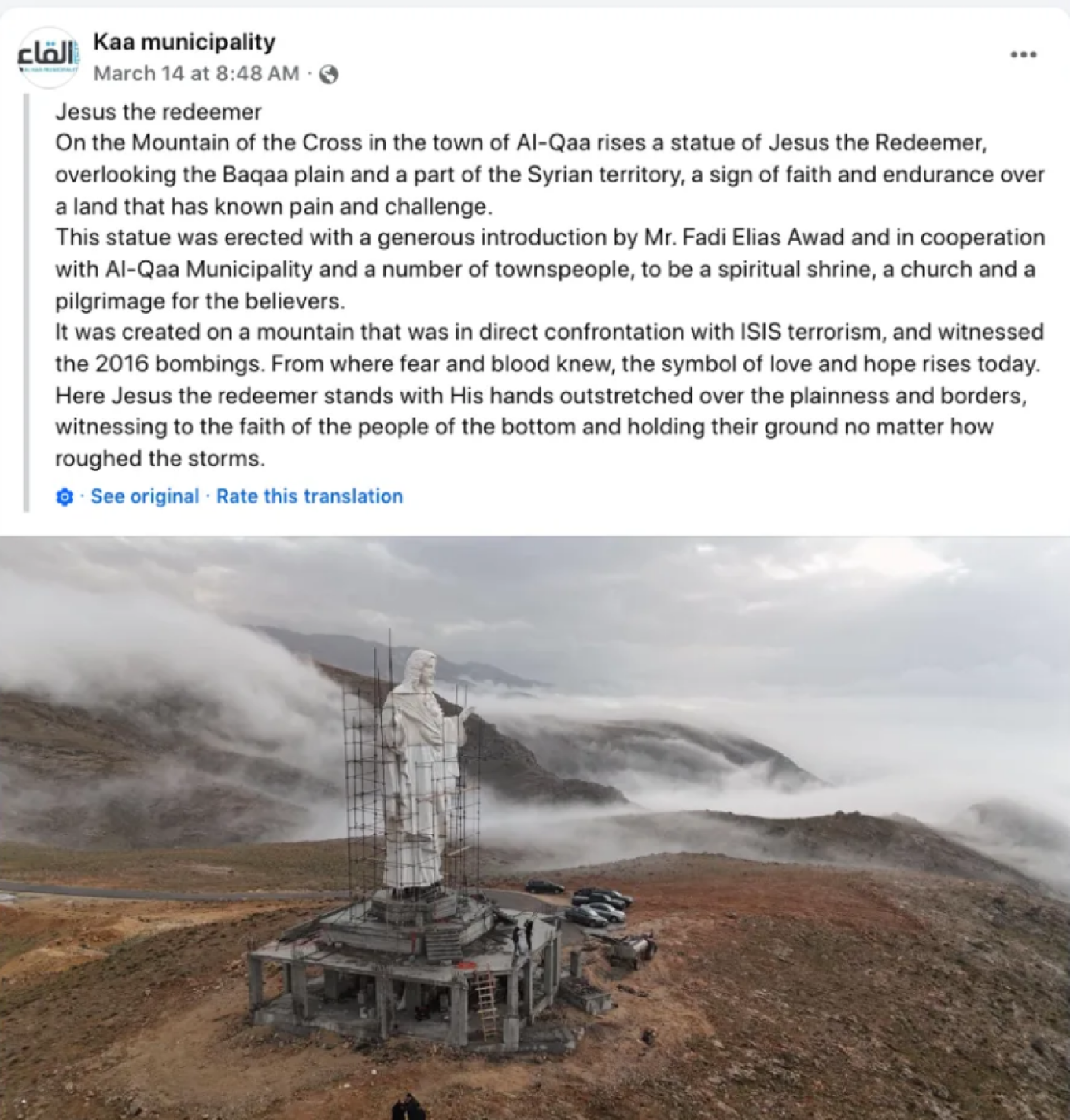 Όπως αναφέρει ο τοπικός δήμος, το άγαλμα κατασκευάστηκε με δωρεά του κατοίκου Φάντι Ελίας Αουάντ ώστε να αποτελέσει έμβλημα της πίστης και της αντοχής σε μια περιοχή που έχει υποφέρει πολύ.