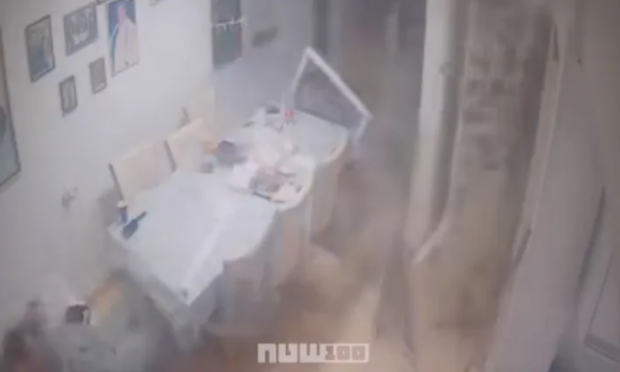 Στο βίντεο που κυκλοφορεί στα social media, μια γυναίκα κάθεται στο σαλόνι του σπιτιού της όταν ξαφνικά ακούγονται δυνατές εκρήξεις. Έντρομη, προσπαθεί να προστατευτεί τρέχοντας, καθώς αντικείμενα πέφτουν γύρω της.