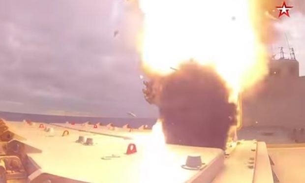 Στο πρόσφατο βίντεο, η ρωσική φρεγάτα εκτελεί βολές εκτοξεύοντας πυραύλους Kalibr, οι οποίοι χάρη στα προηγμένα λειτουργικά στοιχεία και χαρακτηριστικά τους, διανύουν μια ιδιαίτερα μεγάλη απόσταση άνω των 250 χιλιομέτρων, προτού χτυπήσουν και «ισοπεδώσουν» τον στόχο με ακρίβεια, όπως απεικονίζεται στα πλάνα.