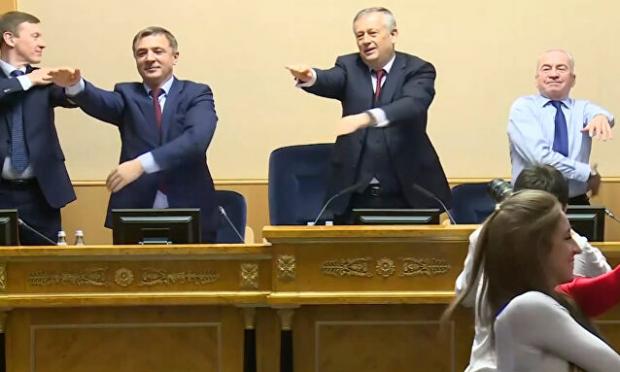 Δύο μαζορέτες καθοδηγούσαν με απλές κινήσεις τους Ρώσους βουλευτές, οι οποίοι ακολουθούσαν στο ρυθμό της μουσικής.