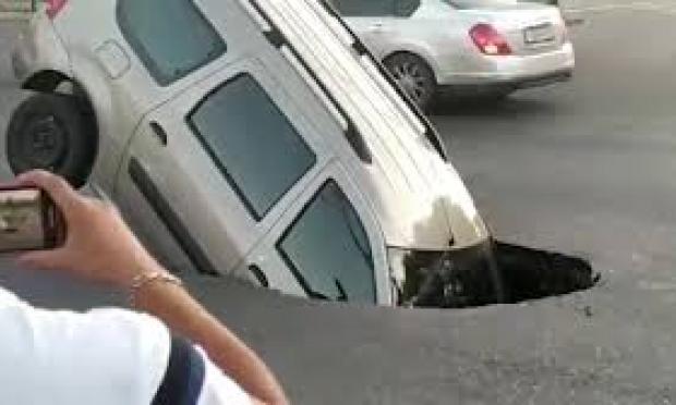 Ένα αμάξι σχεδόν εξαφανίστηκε από προσώπου γης, όταν κινούμενο σε δρόμο της πόλης Αστραχάν στη Ρωσία έπεσε σε τεράστια λακκούβα.