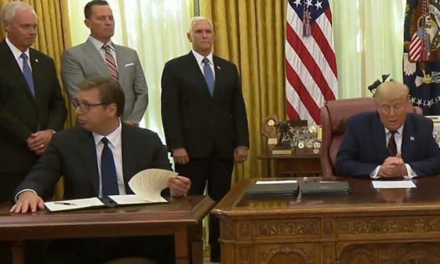 Η εικόνα του Βούτσιτς που δημοσίευσε η Ζαχάροβα τον απεικονίζει να κάθεται απέναντι από τον Πρόεδρο των ΗΠΑ Ντόναλντ Τραμπ στον Λευκό Οίκο την περασμένη Παρασκευή, όπου παρευρέθηκε σε τελετή υπογραφής, με τη μεσολάβηση των ΗΠΑ, ομαλοποίησης των οικονομικών σχέσεων με το Κόσοβο.