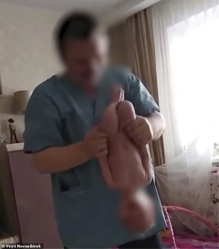 Στις εικόνες φαίνεται ο Μιχαήλ Μικίνοφ να σφίγγει το κεφάλι ενός παιδιού ανάμεσα στα γόνατά του πριν να στρίψει το κορμάκι του κατά 180 μοίρες.