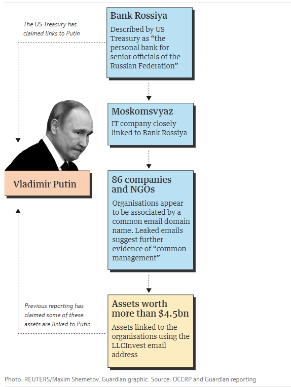 Η γνωστή βρετανική εφημερίδα επικαλείται ανώνυμο Ρώσο εμπειρογνώμονα σύμφωνα με τον οποίο 86 φαινομενικά ασύνδετες εταιρείες ή μη κερδοσκοπικοί οργανισμοί, φαίνεται να έχουν διεύθυνση ηλεκτρονικού ταχυδρομείου στο LLCInvest.ru.