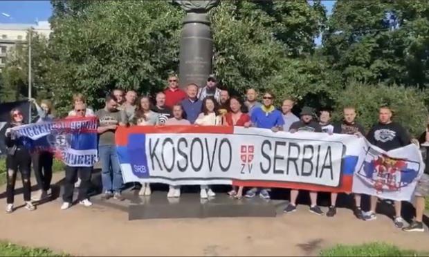 Σε αυτό το βίντεο κρατούν το πανό στα χέρια τους και φωνάζουν «Κόσοβο είναι η καρδιά της Σερβίας».