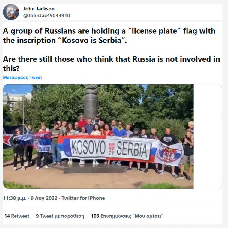 Το πανό στη Ρωσία σχεδιάστηκε από Σέρβους του Κοσσυφοπεδίου, οι οποίοι αντιτίθενται στην εφαρμογή των αρχών της Πρίστινα να καθιερώσουν πινακίδες κυκλοφορίας του Κοσσυφοπεδίου στα αυτοκίνητα των Σέρβων του Κοσόβου.