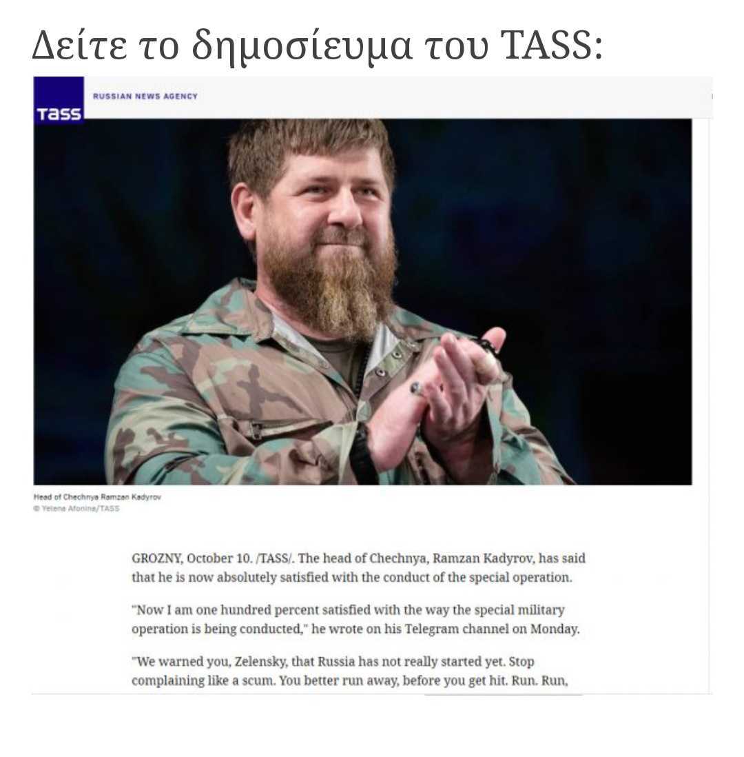 «Σε προειδοποιήσαμε, Ζελένσκι, ότι η Ρωσία δεν έχει ξεκινήσει πραγματικά ακόμη. Σταμάτα να παραπονιέσαι σαν απόβρασμα. Καλύτερα να φύγεις μακριά, πριν σε χτυπήσουν. Τρέξε. Τρέξε, Ζελένσκι, τρέξε χωρίς να κοιτάξεις πίσω στη Δύση», πρόσθεσε ο Καντίροφ.