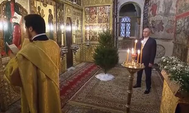 Φορώντας ένα μπλε παλτό και λευκό ζιβάγκο, ο Βλαντιμίρ Πούτιν ήταν ο μόνος πιστός που παρευρέθηκε στη λειτουργία. Έκανε τον σταυρό πολλές φορές πριν διακοπεί το τηλεοπτικό ρεπορτάζ για να δείξει στους τηλεθεατές τη λειτουργία στον Καθεδρικό Ναό του Χριστού Σωτήρος στη Μόσχα, αναφέρει το Reuters.