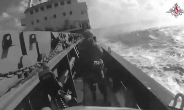 Αυτό που φαίνεται να είναι πλάνα από κάμερα σώματος από τη μονάδα του ναυτικού, δείχνει Ρώσους στρατιώτες με αυτόματα όπλα να ελέγχουν το πλοίο και να μπαίνουν στη γέφυρα.