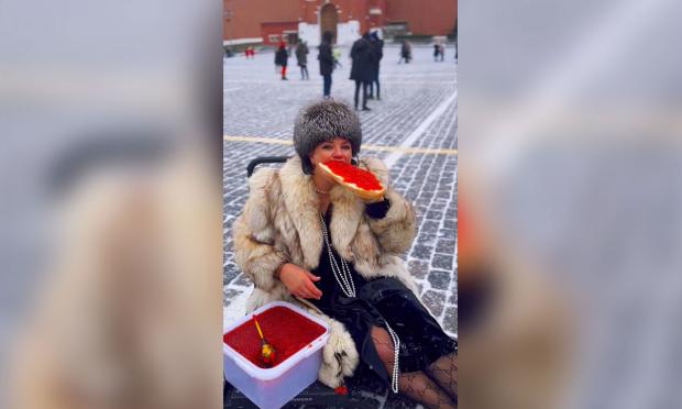 Η εκκεντρική, το δίχως άλλο, Ρωσίδα, μετέφερε ένα πλαστικό κουτί, που περιείχε 14 κιλά κόκκινο χαβιάρι. Αφού... στρογγυλοκάθισε καταμεσής της πλατείας, άρχισε να απλώνει «γενναίες» στρώσεις από μπρικ -όπως αποκαλείται αλλιώς το κόκκινο χαβιάρι- πάνω σε μια μεγάλη φέτα ψωμί, απολαμβάνοντας έτσι ένα σαφώς ασυνήθιστο σάντουιτς.