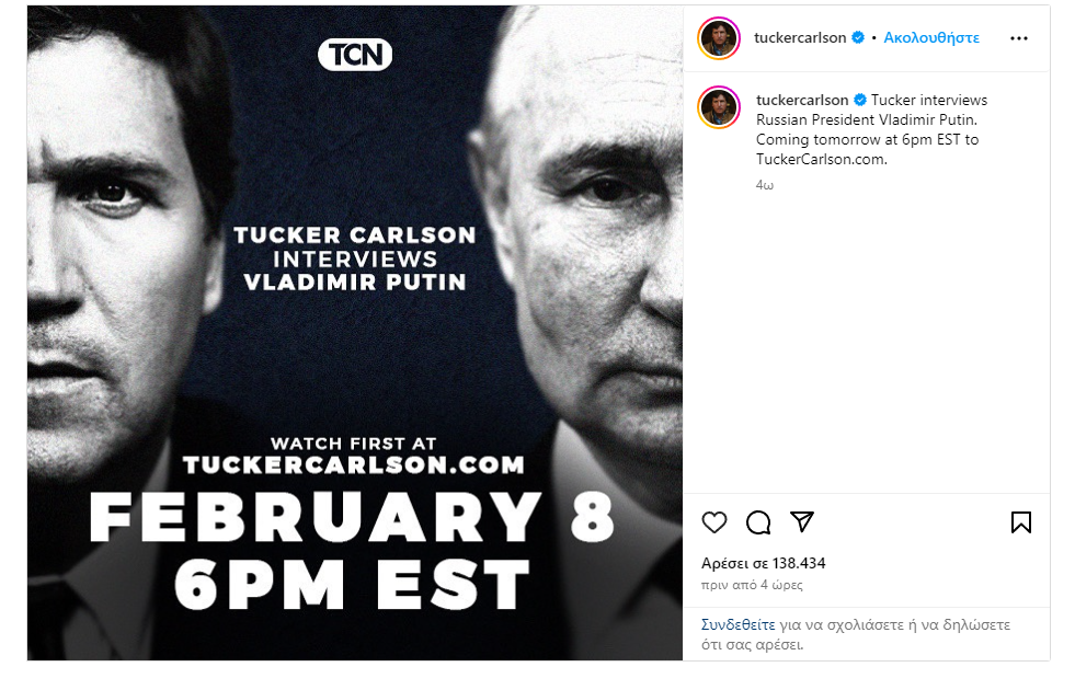 Μεγάλη συζήτηση έχει πυροδοτήσει η συνέντευξη που έδωσε ο Ρώσος πρόεδρος Βλαντιμίρ Πούτιν στον Αμερικανό δημοσιογράφο και παρουσιαστή Τάκερ Κάρλσον.