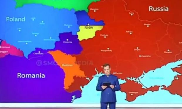 Σε δημόσια διάλεξή του ο Μεντβέντεφ, εξαφάνισε σχεδόν όλη την Ουκρανία από το χάρτη (με εξαίερεση το Κίεβο) προσθέτοντας ότι οι αμερικανικές ειδικές δυνάμεις και στρατιωτικοί σύμβουλοι ήδη διεξάγουν πόλεμο στη Ρωσία.