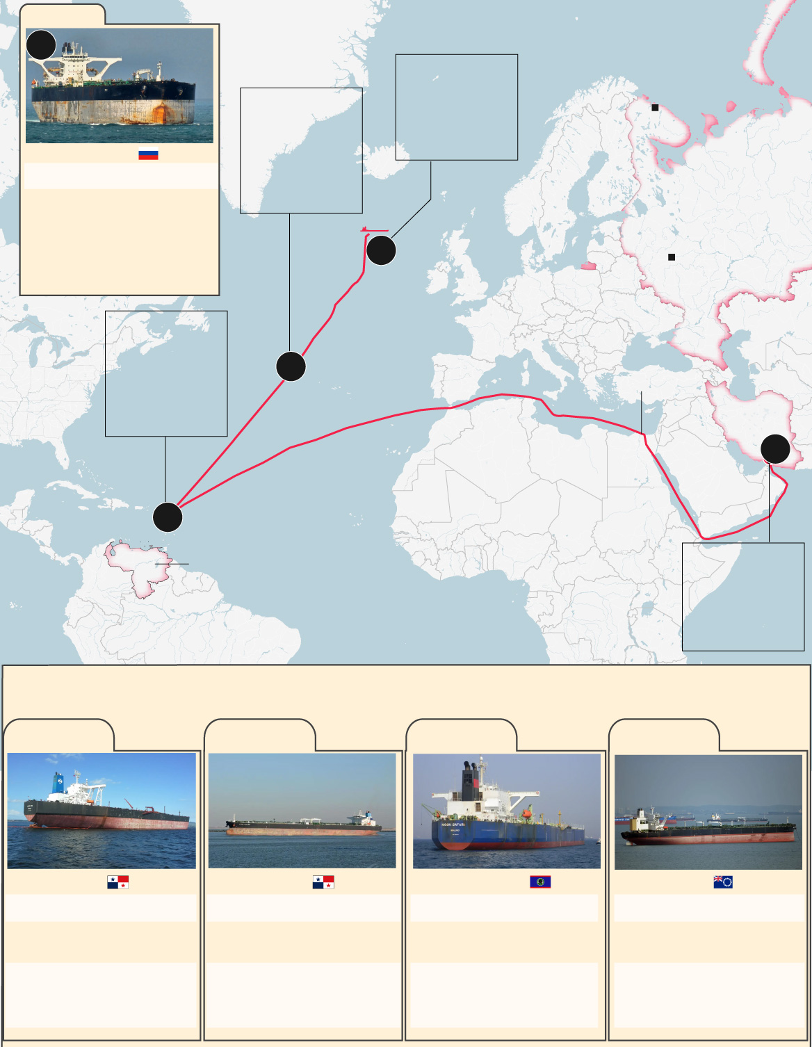Και τα πέντε πλοία υπόκεινται σε κυρώσεις των ΗΠΑ για τη μεταφορά ιρανικού ή ρώσικο πετρελαίου και αποφεύγουν τη σύλληψη από την πλευρά των ΗΠΑ.