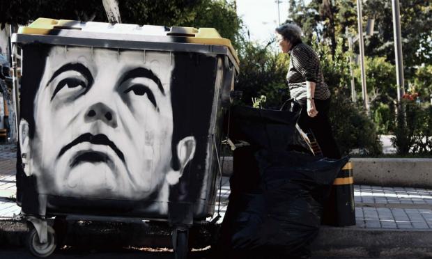 Ένας κάδο σκουπιδιών σε δρόμο της Αθήνας, κοσμεί εδώ και λίγες μέρες το πρόσωπο του Αλέξη Τσίπρα...
