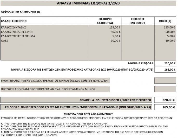 Όσοι πληρώσουν την εισφορά Απριλίου έως την Τετάρτη 10 Ιουνίου δικαιούνται την έκπτωση 25% στο ασφάλιστρο, εφόσον έχουν εξοφλήσει τις υπόλοιπες εισφορές 2020 (Ιανουαρίου, Φεβρουαρίου, Μαρτίου). Την έκπτωση 25% που ρίχνει το ελάχιστο ασφάλιστρο των ελευθέρων επαγγελματιών από 220€ σε 165€ δικαιούνται όλοι οι ελεύθεροι επαγγελματίες και αυτοαπασχολούμενοι, είτε πλήττονται από τον κορωνοιό είτε όχι, αρκεί να πληρώσουν εμπρόθεσμα μέχρι 10 Ιουνίου.