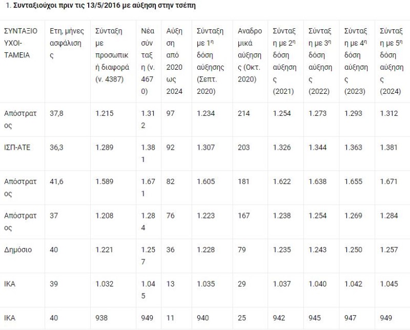 1. Αυξήσεις σε 5 δόσεις για τους συνταξιούχους που είχαν αποχωρήσει πριν από τον νόμο Κατρούγκαλου (πριν τις 13/5/2016) με 30 έτη ασφάλισης και άνω. Η πρώτη δόση θα πληρωθεί τον Σεπτέμβριο και οι επόμενες 4 στα έτη 2021, 2022, 2023 και 2024. Για παράδειγμα, αν ο συνταξιούχος έχει αύξηση 100 ευρώ, θα πάρει 20 ευρώ τον Σεπτέμβριο και από 20 ευρώ τον μήνα για τα έτη 2021-2024. Τα αναδρομικά της πρώτης δόσης της αύξησης θα είναι από 1ης/10/2019 ως Σεπτέμβριο 2020, δηλαδή για 11 μήνες, και θα πληρωθούν τον Οκτώβριο του 2020.