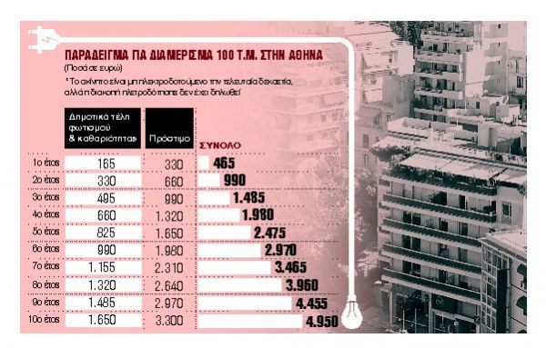 Στον Δήμο Αθηναίων τα δημοτικά τέλη φωτισμού και καθαριότητας μιας κατοικίας 100 τ.μ. ανέρχονται σε 165 ευρώ τον χρόνο, ενώ για ένα κατάστημα ή αποθήκη ίδιας επιφάνειας τα δημοτικά τέλη φθάνουν τα 650 ευρώ τον χρόνο. Τα πρόστιμα που επιβάλλονται είναι διπλάσια για μη καταβολή των τελών, που σημαίνει ότι για το κατάστημα το χαράτσι φθάνει τα 1.300 ευρώ τον χρόνο και για την κατοικία τα 330 ευρώ τον χρόνο. Ετσι αν κάποιος έχει μια υπόγεια αποθήκη 250 τ.μ. ξενοίκιαστη για μια πενταετία, δηλαδή ουσιαστικά άνευ αξίας, θα του ζητήσουν να πληρώσει δημοτικά τέλη 1.625 ευρώ x 5 = 8.125 ευρώ συν το πρόστιμο!