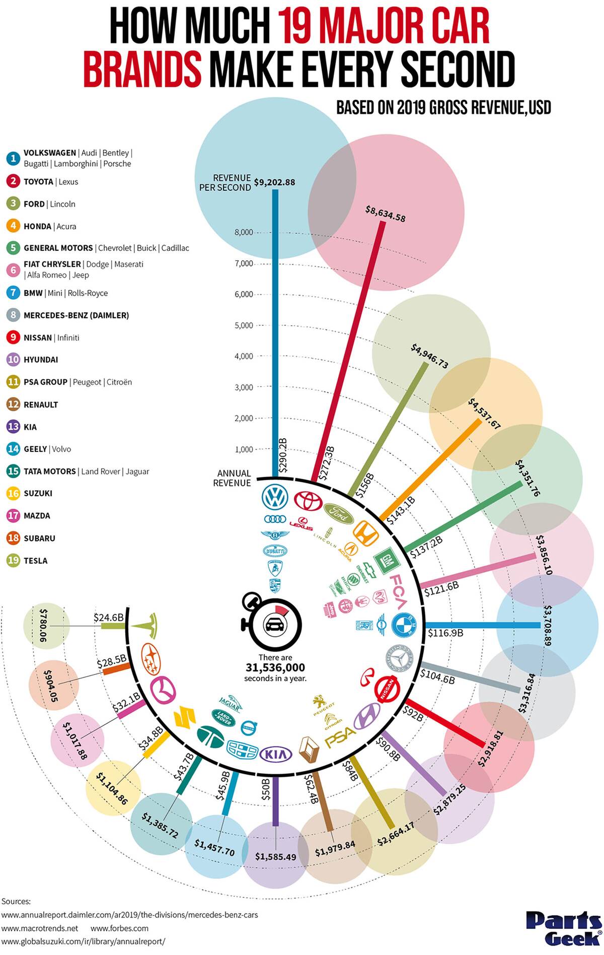 Όλα τα νούμερα αφορούν το κέρδος των κατασκευαστών το δευτερόλεπτο και δύο είναι αυτά που πραγματικά ξεχωρίζουν: του ομίλου Volkswagen με 9.202 δολάρια και της Toyota με 8.946 δολάρια (πάντα ανά δευτερόλεπτο). Το νούμερο της Toyota είναι πραγματικά εξαιρετικό αν σκεφτεί κανείς πως στο γερμανικό όμιλο ανήκουν πολλές μάρκες (Lamborghini, VW, Audi, Skoda, Porsche, Bentley, Bugatti κ.α.).