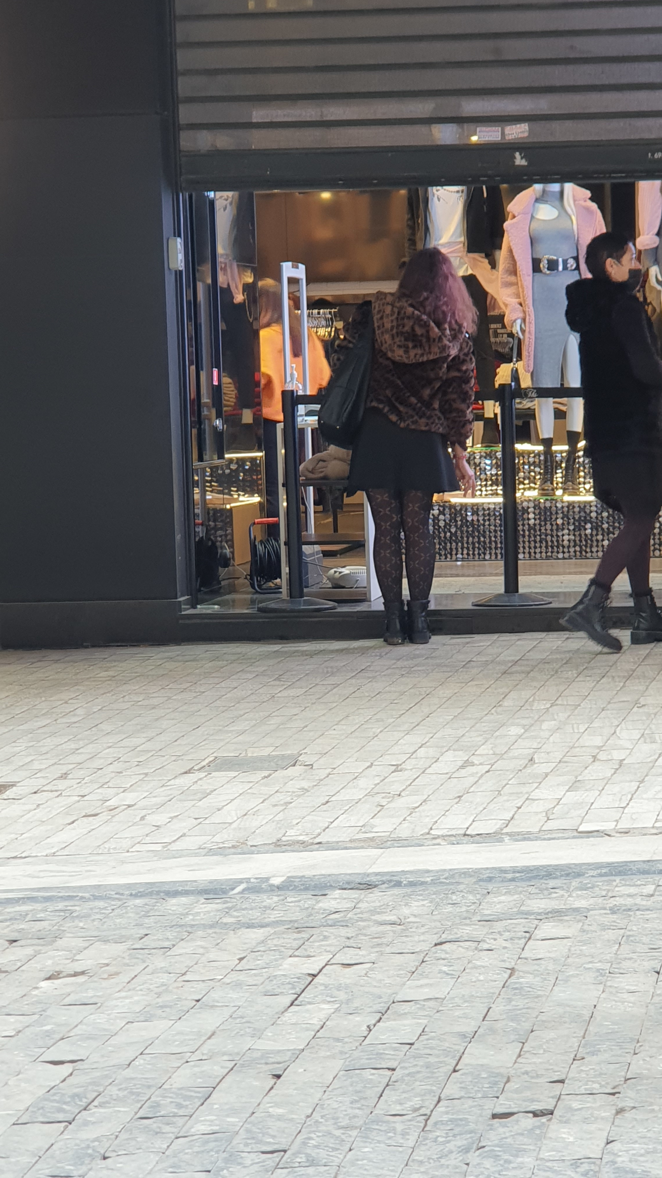 Στο τέλος του πεζόδρομου της Ερμού, δυο κυρίες προσπαθούν να πείσουν την πωλήτρια που στέκεται στην πόρτα να δοκιμάσουν κοσμήματα.