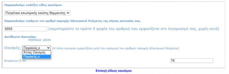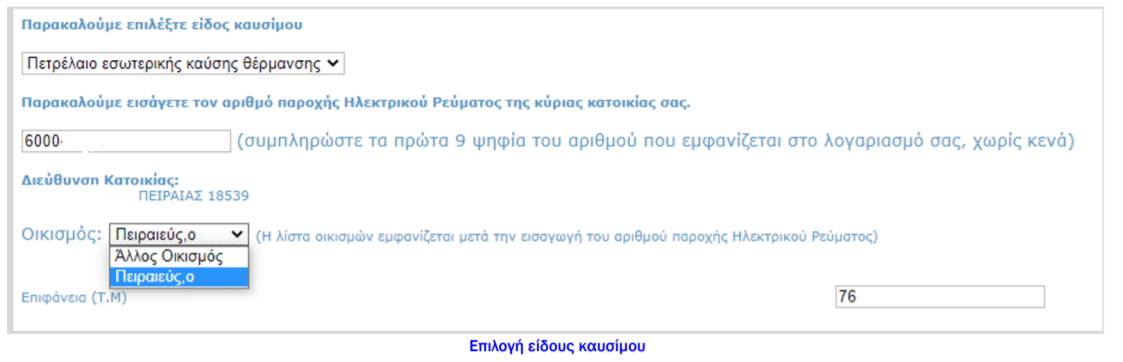 Στην πρώτη ενότητα της φόρμας ο χρήστης καλείται να επιλέξει είδος καυσίμου [Πετρέλαιο εσωτερικής καύσης θέρμανσης, Φυσικό αέριο, Καυσόξυλα, Βιομάζα (πέλετ) ή Υγραέριο] και ζητείται ο αριθμός παροχής ηλεκτρικού ρεύματος της κύριας κατοικίας του χρήστη. Με τη συμπλήρωση ενός έγκυρου αριθμού παροχής, εμφανίζεται από κάτω η διεύθυνση στην οποία βρίσκεται η συγκεκριμένη παροχή.
