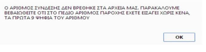 Σε περίπτωση που δοθεί λάθος αριθμός παροχής ηλεκτρικού ρεύματος, εμφανίζεται το ακόλουθο παράθυρο:
