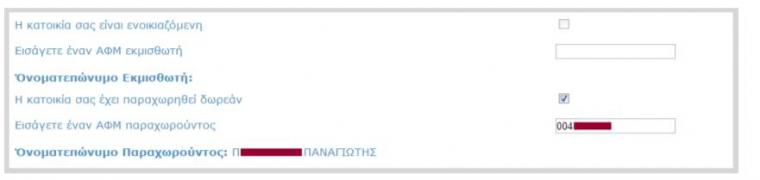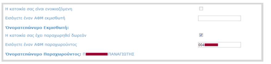 Στην επόμενη ενότητα ζητούνται στοιχεία που αφορούν την κύρια κατοικία και συγκεκριμένα αν η κατοικία είναι ενοικιαζόμενη ή έχει παραχωρηθεί δωρεάν. Σε όποια περίπτωση ισχύει αυτό, ο χρήστης καλείται να συμπληρώσει και τον Α.Φ.Μ. ενός εκ των εκμισθωτών ή των δωρεάν παραχωρούντων. Εάν η κατοικία είναι ιδιόκτητη, τότε ο χρήστης δε συμπληρώνει τίποτα από αυτά.