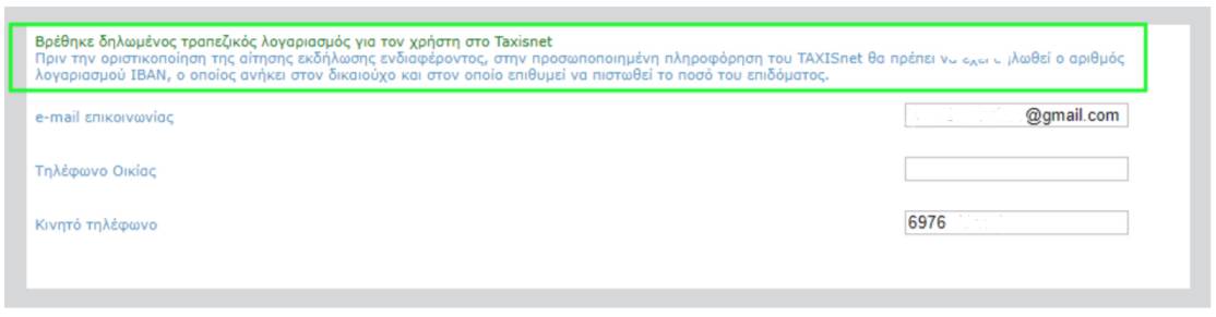 Τέλος, η τελευταία ενότητα της αίτησης περιλαμβάνει τα στοιχεία επικοινωνίας. Πριν την οριστικοποίηση της αίτησης εκδήλωσης ενδιαφέροντος, στην προσωποποιημένη πληροφόρηση του TAXISnet θα πρέπει να έχει δηλωθεί ο αριθμός λογαριασμού ΙΒΑΝ, ο οποίος ανήκει στον δικαιούχο και στον οποίο επιθυμεί να πιστωθεί το ποσό του επιδόματος. Σε αυτή την περίπτωση θα εμφανιστεί με πράσινο χρώμα το παρακάτω μήνυμα «Βρέθηκε δηλωμένος τραπεζικός λογαριασμός για τον χρήστη στο Taxisnet».