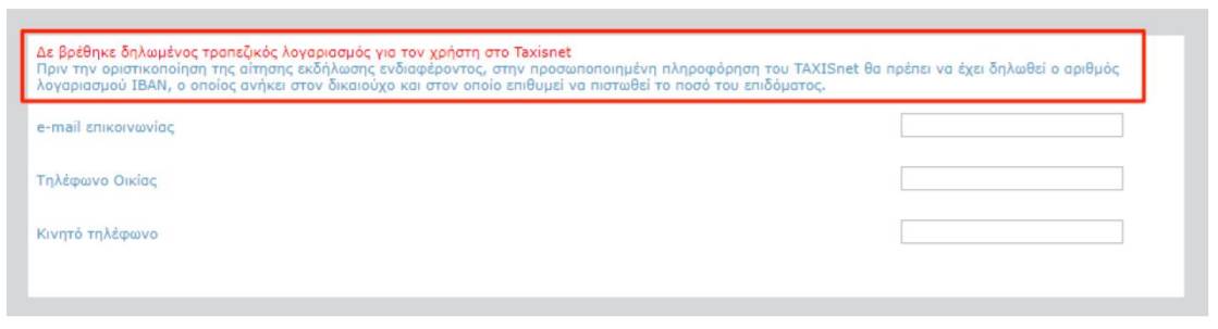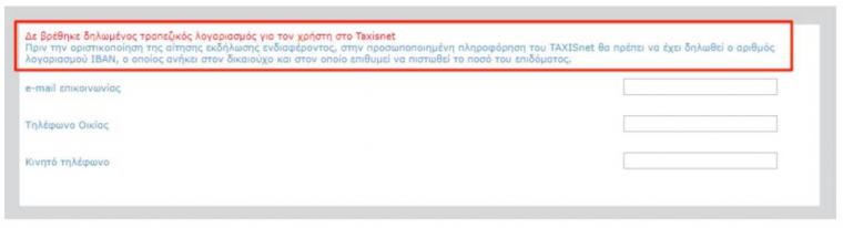 Σε αντίθετη περίπτωση θα πρέπει να δηλώσετε τον αριθμό IBAN στην προσωποποιημένη πληροφόρηση του TAXISnet έτσι ώστε να είναι δυνατή η υποβολή της αίτησης.