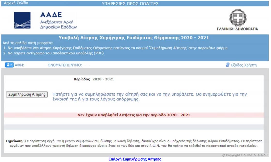 Για να συνεχίσετε επιλέγετε το πλήκτρο «Συμπλήρωση Αίτησης