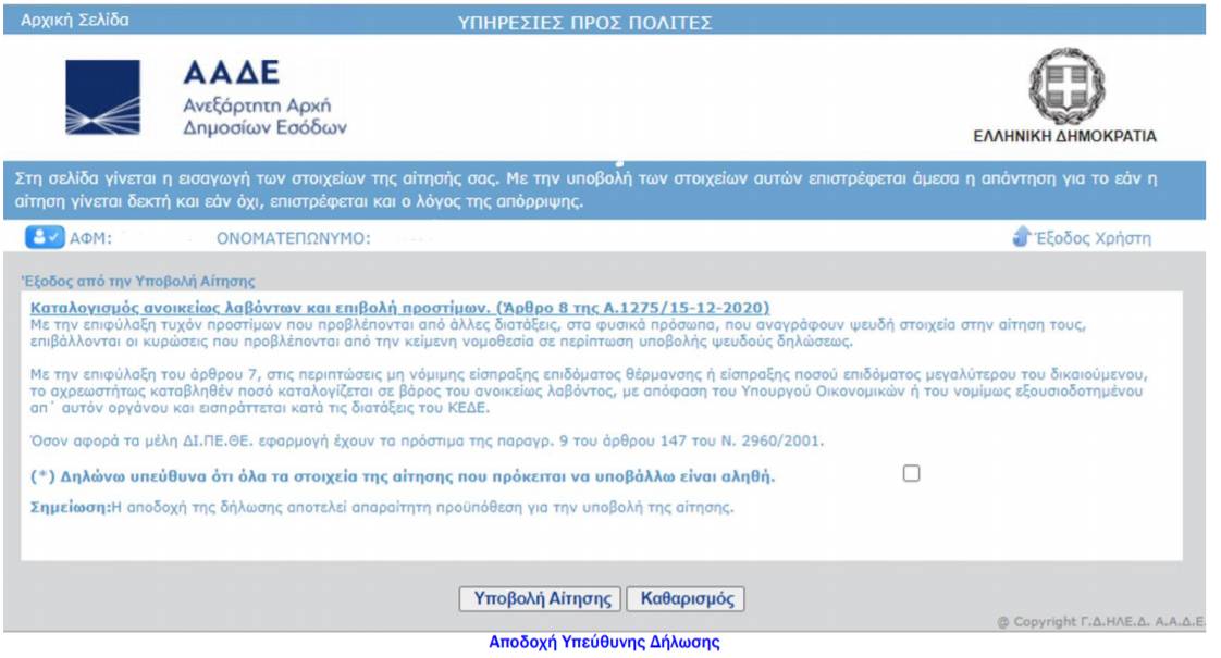 Εμφανίζεται η αρχική οθόνη της αίτησης, την οποία ο χρήστης πρέπει να μελετήσει και να αποδεχτεί την υπεύθυνη δήλωση ότι όλα τα στοιχεία που θα συμπληρωθούν στην αίτηση είναι αληθή.