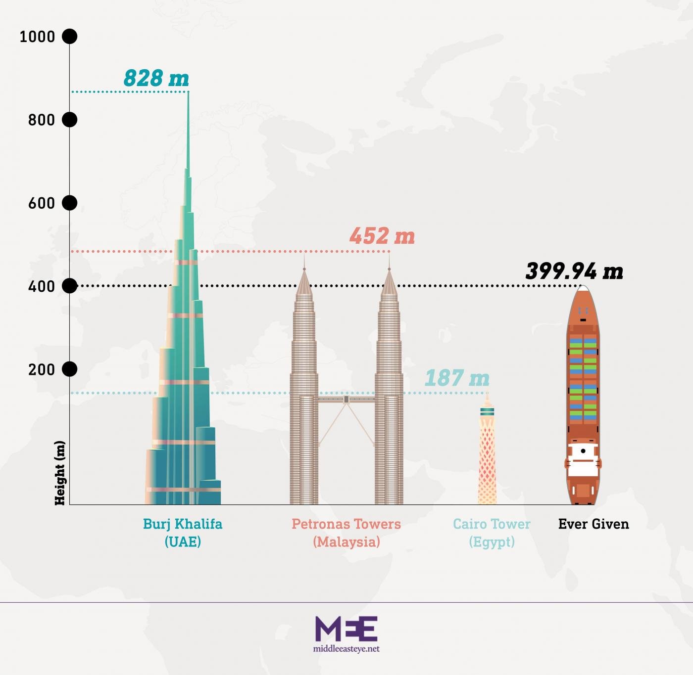 Με μήκος 400 μέτρα και πλάτος 59 μέτρα, το Ever Given έχει διπλάσιο μέγεθος από τον πύργο του Καΐρου της Αιγύπτου και μόλις το μισό από το μέγεθος του Burj Khalifa στο Ντουμπάι, που είναι το ψηλότερο κτίριο στον κόσμο. Ωστόσο, ήταν αρκετά ευκίνητο για να σχεδιάσει μαι διαδρομή στην Ερυθρά Θάλασσα πριν μπει στο κανάλι.