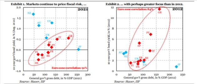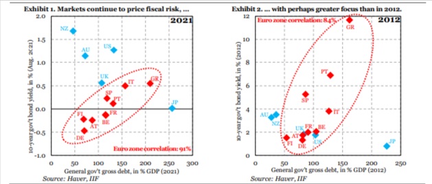 Εάν όμως συγκεντρωθεί η προσοχή στην Ευρωζώνη «εμφανίζεται ένας σαφής σύνδεσμος μεταξύ αποδόσεων ομολόγων και χρέους, με υψηλότερες αποδόσεις για την Ιταλία και την Ελλάδα έναντι της Αυστρίας, της Φινλανδίας και της Γερμανίας.