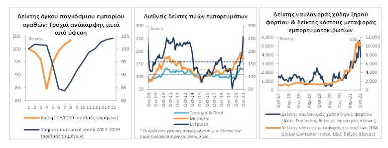 Η επιτάχυνση του πληθωρισμού διεθνώς αντανακλά κυρίως την ισχυρότερη και ταχύτερη από το αναμενόμενο ανάκαμψη της παγκόσμιας ζήτησης, που ακολούθησε την καθίζηση του 2020 λόγω της πανδημίας, σε συνδυασμό με την αργή ανταπόκριση της προσφοράς. Πράγματι, η δυναμική της παγκόσμιας οικονομίας ξεπέρασε και τις πιο αισιόδοξες εκτιμήσεις, με την παγκόσμια μεταποιητική παραγωγή και το διεθνές εμπόριο να υπερβαίνουν τα προ-πανδημίας επίπεδά τους ήδη από τα τέλη του 1ου τριμήνου του 2021. Από την πλευρά της προσφοράς, η παγκόσμια παραγωγική αλυσίδα – που στηρίζεται, κατά βάση, σε χαμηλά αποθέματα και σε ευρύτατη γεωγραφική διασπορά της παραγωγής – καθώς και ο τομέας των μεταφορών, δυσκολεύτηκαν να παρακολουθήσουν την τροχιά της ζήτησης μετά από ένα έτος σχετικής αδράνειας και αναστολής των επενδύσεων.
